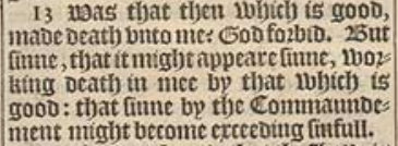 13 Was that then which is good, made death vnto me? God forbid. But sinne, that it might appeare sinne, working death in mee by that which is good: that sinne by the Commaundement might become exceeding sinfull.