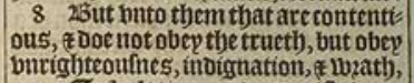 8 But vnto them that are contentious, & doe not obey the trueth, but obey vnrighteousnes, indignation, & wrath,