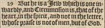 29 But he is a Iew which is one inwardly, and Circumcision is, that of the heart, in the spirit, and not in the letter, whose praise is not of men, but of God.