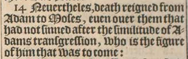 14 Neuertheles, death reigned from Adam to Moses, euen ouer them that had not sinned after the similitude of Adams transgression, who is the figure of him that was to come: