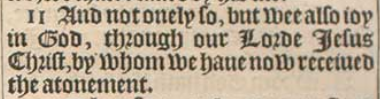 11 And not onely so, but wee also ioy in God, through our Lorde Iesus Christ, by whom we haue now receiued the atonement.