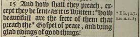 15 And how shall they preach, except they be sent? as it is written: *How beautifull are the feete of them that preach the *Gospel of peace, and bring glad tidings of good things! [*Esa.52.7. naum.1.15]