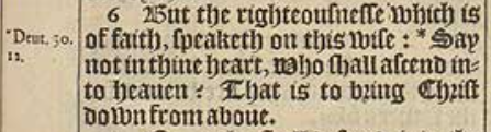 6 But the righteousnesse which is of faith, speaketh on this wise: *Say not in thine heart, Who shall ascend into heauen? That is to bring Christ down from aboue. [*Deut.30. 12.]