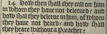 14 How then shall they call on him in whom they haue not beleeued? and how shal they beleeue in him, of whom they haue not heard? and how shall they heare without a Preacher?