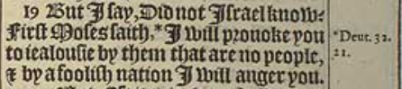 19 But I say, Did not Israel know? First Moses saith, *I will prouoke you to iealousie by them that are no people, & by a foolish nation I will anger you. [*Deut.32. 21.]