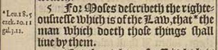 5 For Moses describeth the righteousnesse which is of the Law, that *the man which doeth those things shall liue by them.[*Leu.18.5 ezek.20.11 gal.3.12.]