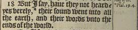 18 But I say, haue they not heard? yes verely, *their sound went into all the earth, and their words vnto the ends of the world.[*Psal.19.4.]