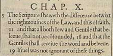 5 The Scripture sheweth the difference betwixt the righteousnes of the Law, and this of faith, 11 and that all both Iew and Gentile that beleeue, shal not be cōfounded, 18 and that the Gentiles shall receiue the word and beleeue. 19 Israel was not ignorant of these things.