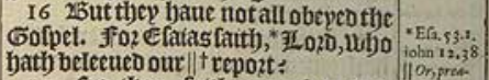 16 But they haue not all obeyed the Gospel. For Esaias saith, *Lord, who hath beleeued our ||+report? [*Esa.53.1. iohn 12.38 , ||Or, preaching. , +Gr. the hearing of vs.]