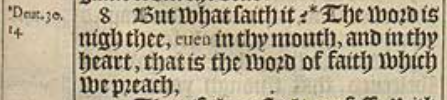 8 But what saith it? *The word is nigh thee, euen in thy mouth, and in thy heart, that is the word of faith which we preach,[*Deut.30. 14.]