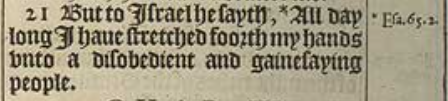 21 But to Israel he sayth, *All day long I haue stretched foorth my hands vnto a disobedient and gainesaying people.[*Esa.65.2.]