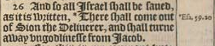26 And so all Israel shall be saued, as it is written, *There shall come out of Sion the Deliuerer, and shall turne away vngodlinesse from Iacob.[*Esa.59.20]