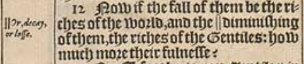 12 Now if the fall of them be the riches of the world, and the || diminishing of them, the riches of the Gentiles: how much more their fulnesse?[||Or, decay, or losse.]