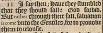 11 I say then; Haue they stumbled that they should fall? God forbid. But rather through their fall, saluation is come vnto the Gentiles, for to prouoke them to ielousie.