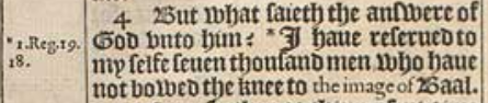 4 But what saieth the answere of God vnto him? *I haue reserued to my selfe seuen thousand men, who haue not bowed the knee to the image of Baal.[*1.Reg.19. 18.]