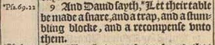 9 And Dauid sayth, *Let their table be made a snare, and a trap, and a stumbling blocke, and a recompense vnto them.[*Psa.69.22 ]