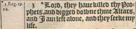 3 *Lord, they haue killed thy Prophets, and digged downe thine Altars, and I am left alone, and they seeke my life. [*1.Reg.19. 14.]