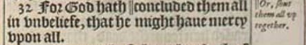 32 For God hath ||concluded them all in vnbeliefe, that he might haue mercy vpon all.[||Or, shut them all vp together.]