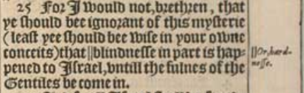 25 For I would not, brethren, that ye should bee ignorant of this mysterie (least yee should bee wise in your owne conceits) that ||blindnesse in part is happened to Israel, vntill the fulnes of the Gentiles be come in.[|| Or, hardnesse.]