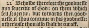 22 Beholde therefore the goodnesse and seueritie of God: on them which fell, seueritie; but towards thee, goodnesse, if thou continue in his goodnesse: otherwise thou also shalt be cut off.