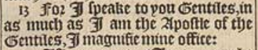 13 For I speake to you Gentiles, in as much as I am the Apostle of the Gentiles, I magnifie mine office:
