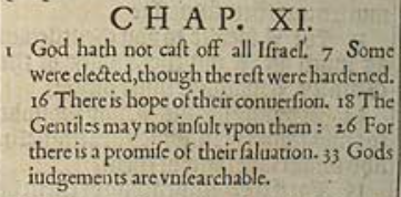 1 Gott hat nicht ganz Israel verstoßen. 7 Einige sind auserwählt, doch der Rest wurde verhärtet. 16 Da ist Hoffnung auf ihre Bekehrung. 18 Die Nichtjuden sollen sie nicht beleidigen: 26 Denn da ist eine Verheißung ihrer Errettung. 33 Gottes Urteile sind unergründlich.