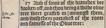17 And if some of the branches bee broken off, and thou being a wilde oliue tree wert graffed in ||amongst them, and with them partakest of the roote and fatnesse of the Oliue tree:[|| Or, for them.]