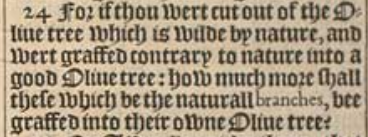 24 For if thou wert cut out of the Oliue tree which is wilde by nature, and wert graffed contrary to nature into a good Oliue tree: how much more shall these which be the naturall branches, bee graffed into their owne Oliue tree?