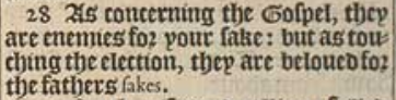 28 As concerning the Gospel, they are enemies for your sake: but as touching the election, they are beloued for the fathers sakes.