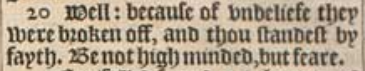 20 Well: because of vnbeliefe they were broken off, and thou standest by fayth. Be not high minded, but feare.