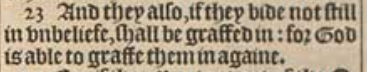 23 And they also, if they bide not still in vnbeliefe, shall be graffed in: for God is able to graffe them in againe.