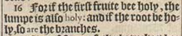 16 For if the first fruite bee holy, the lumpe is also holy: and if the root be holy, so are the branches.