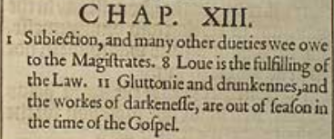 1 Subiection, and many other dueties wee owe to the Magistrates. 8 Loue is the fulfilling of the Law. 11 Gluttonie and drunkennes, and the workes of darkenesse, are out of season in the time of the Gospel.