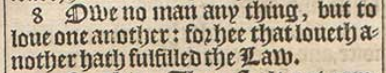 8 Owe no man any thing, but to loue one another: for hee that loueth another hath fulfilled the Law.