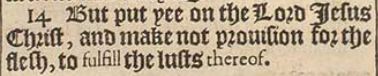 14 But put yee on the Lord Iesus Christ, and make not prouision for the flesh, to fulfill the lusts thereof.