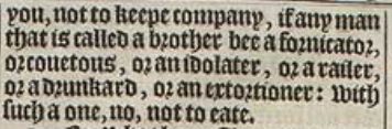 11 But now I haue written vnto you, not to keepe company, if any man that is called a brother bee a fornicator, or couetous, or an idolater, or a railer, or a drunkard, or an extortioner: with such a one, no, not to eate.