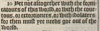 10 Yet not altogether with the fornicatours of this world, or with the couetous, or extortioners, or with idolaters; for then must yee needs goe out of the world.