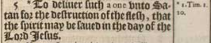 5 *To deliuer such a one vnto Satan for the destruction of the flesh, that the spirit may be saued in the day of the Lord Iesus.[*1.Tim. 1 20]