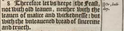 8 Therefore let vs keepe ||the Feast, not with old leauen, neither with the leauen of malice and wickednesse: but with the vnleauened bread of sinceritie and trueth.[|| Or, holiday.]