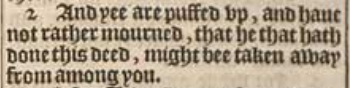 2 And yee are puffed vp, and haue not rather mourned, that he that hath done this deed, might bee taken away from among you.