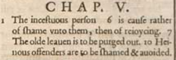 1 Der inzestuöse Mensch 6 ist ihnen eher ein Grund zur Schande als zur Freude. 7 Der alte Sauerteig soll ausgemerzt werden. 10 Schändliche Übeltäter sollen beschämt und gemieden werden.