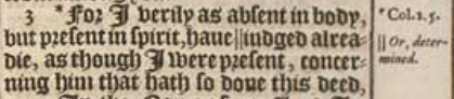 3 *Denn wahrlich, ich habe, obgleich körperlich abwesend, aber gegenwärtig im Geist, bereits ||geurteilt, als ob ich gegenwärtig wäre, betreffend demjenigen, der solche Tat getan hat,[*Kolosser 2:5 ||oder: bestimmt]