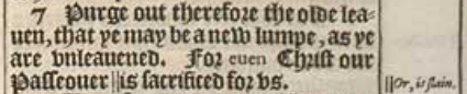 7 Purge out therefore the olde leauen, that ye may be a new lumpe, as ye are vnleauened. For euen Christ our Passeouer ||is sacrificed for vs. [|| Or, is slain.]