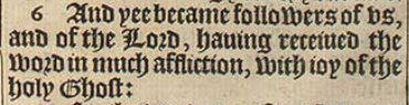 6 And yee became followers of vs, and of the Lord, hauing receiued the word in much affliction, with ioy of the holy Ghost: