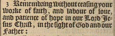 3 Remembring without ceasing your worke of faith, and labour of loue, and patience of hope in our Lord Iesus Christ, in the sight of God and our Father:
