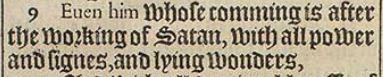 9 Euen him whose comming is after the working of Satan, with all power and signes, and lying wonders,