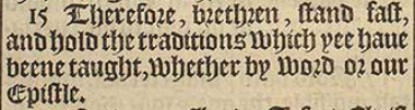 15 Therefore, brethren, stand fast, and hold the traditions which yee haue beene taught, whether by word or our Epistle.