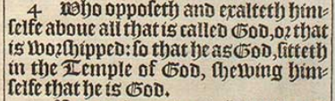 4 Who opposeth and exalteth himselfe aboue all that is called God, or that is worshipped: so that he as God, sitteth in the Temple of God, shewing himselfe that he is God.