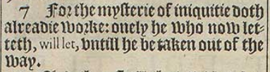 7 For the mysterie of iniquitie doth alreadie worke: onely he who now letteth, will let, vntill he be taken out of the way.