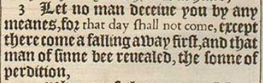 3 Let no man deceiue you by any meanes, for that day shall not come, except there come a falling away first, and that man of sinne bee reuealed, the sonne of perdition,